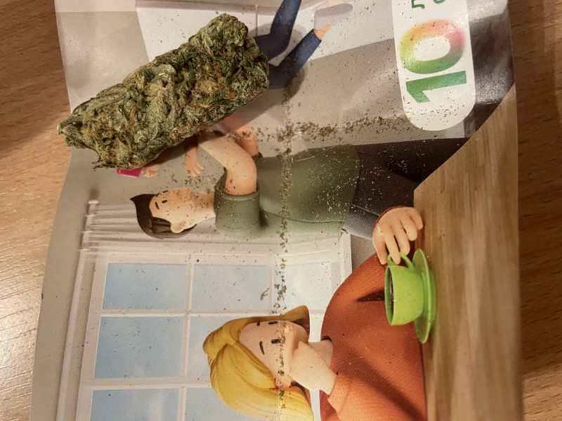 Шиш имеет небольшое количество трихом, сама она приятного цвета изумрудно-коричневого, но немного была влажная(лучше бы конечно долечить шиш) а запах чувствовался через упаковку, пахнет она достаточно резко и как бы это сказать проницающи, как будто ее аромат уходит глубоко в твою носоглотку