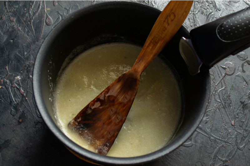 5) В сотейник наливаем 100 мл воды, кидаем кусок масла.