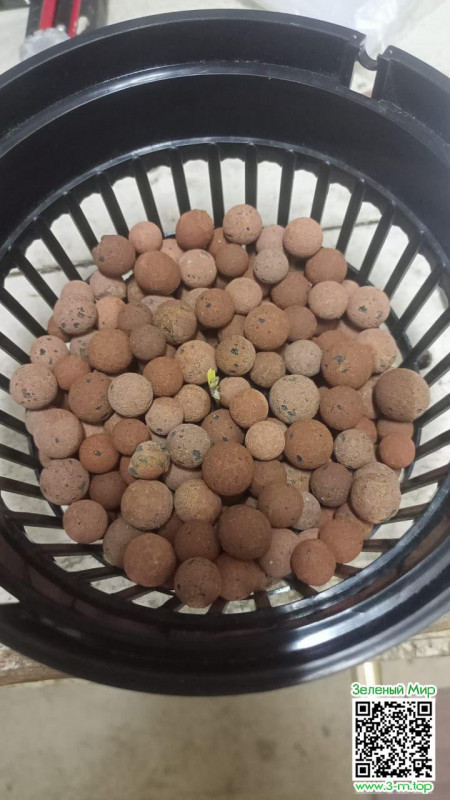 В этом кубике семечке потребовалось сутки, чтоб вылезти на пару сантиметров и скинуть каску. Так же снизу кубика уже показался корешок, а значит можно подключать к системе DWC. Я использую AquaPot XL с рабочим объемом раствора в 25 литров. Но на стадии рассады незачем использовать такой большой объем в виду лишнего расхода удобрений. Поэтому у меня на такой случай есть поменьше, самопал на 10 литров. Как только росток показал корешок снизу, ставим кубик в сетчатый горшок ровно по центру, чтоб корешок был в центральном отверстии горшка и засыпаем керамзит/пеностекло под самые помидоры. В смысле, семядоли. Для того, чтоб сетчатые горшочки чаще разрывались корнями и чтоб чаще их покупали, производитель не делает отверстия по центру дна горшочка. Я просверлил ровно по центру отверстие сверлом на 14мм и вокруг него ещё несколько отверстий на 10-12мм. Так горшочек прослужит почти вечно и не разорвет его корнями по бокам, так как основной корень вылезет по центру сразу к раствору, а не будет искать выходы по бокам в начале роста. К тому же, в центральном отверстии корешок сразу будет орошаться питательным раствором.