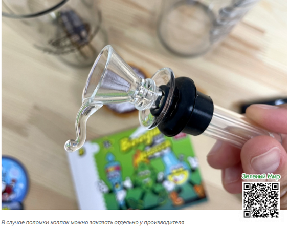 Водник, представленный на фото и подавляющее большинство других стеклянных водников, состоит из трех разборных деталей: внешней и внутренней колбы и колпака. У нижней части колпака имеется прорезиненный уплотнитель для более плотного прилегание к горлышку. Нижняя часть внутренней колбы тоже прорезинена: при погружении она точно не разобьется. В случае поломки колпака, его можно заказать у производителя.