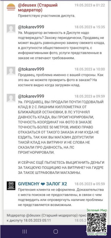 На блэк спрусте есть такой магазин джентельмены. Город Нижний Новгород. Так вот курьер уже пол года делает клады на одной и той же поляне. Итог : клад приделал ноги и на месте нечего небыло. Открываю диспут излагаю аргументы прикрепляю фото и в целом учитывая отзывы магазина думаю что диспут будет в мою пользу. Но нет Модератор решил разделить риски и одобрил только 50% возврата средств. Обходите стороной данный магазин. А уж если попали на проблему и ваш аккаунт слабый удачи не видать