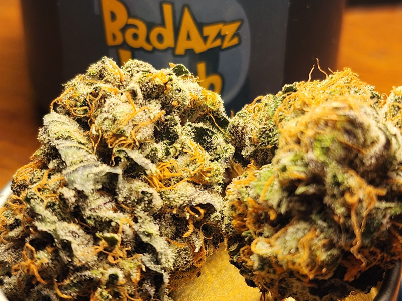 BadAzz имеет плотную структуру шишки, цвет темно зеленый с фиолетовыми вкраплениями, оранжевые трихомы и миллиард кристаллов ТГК.